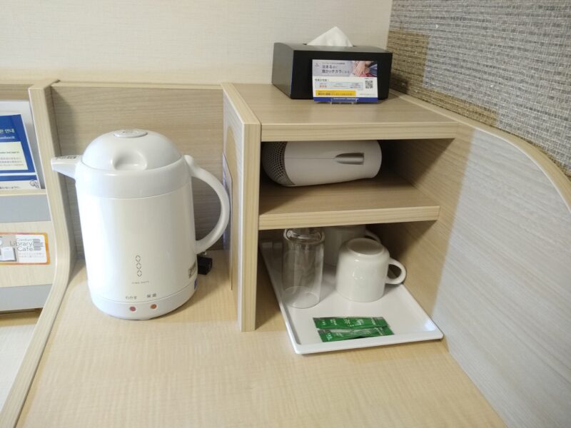 コワーキングスペースでもあるライブラリーカフェに無料の珈琲や紅茶などがあるので、こちらにはコップと粉末の緑茶のみ