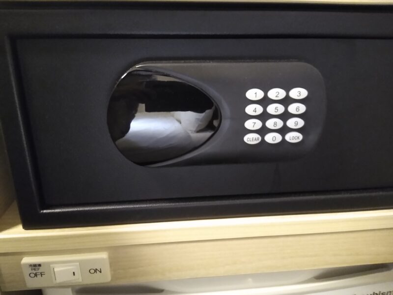 部屋の角にキャビネットと空の冷蔵庫と金庫