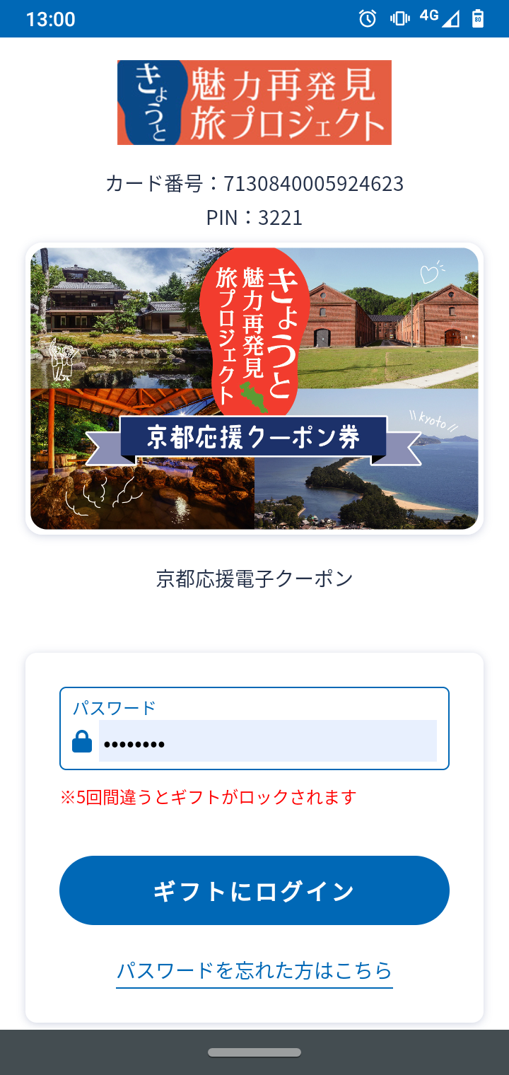 ②パスワードを入力して「ギフトにログイン」を押します