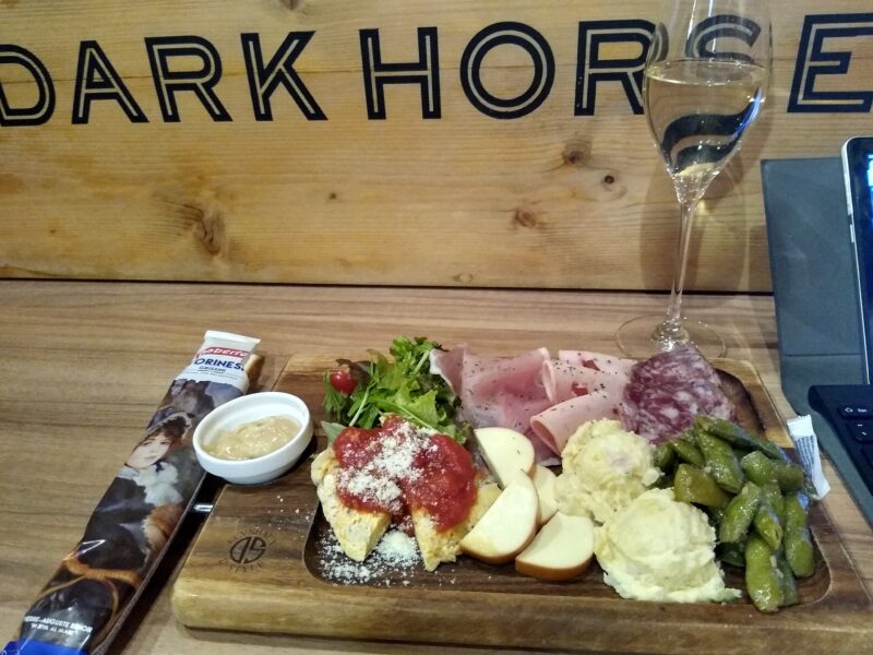 迷うことなく前菜盛り合わせをお願いし、ついでにワイン(泡)500円…というのを頼みます