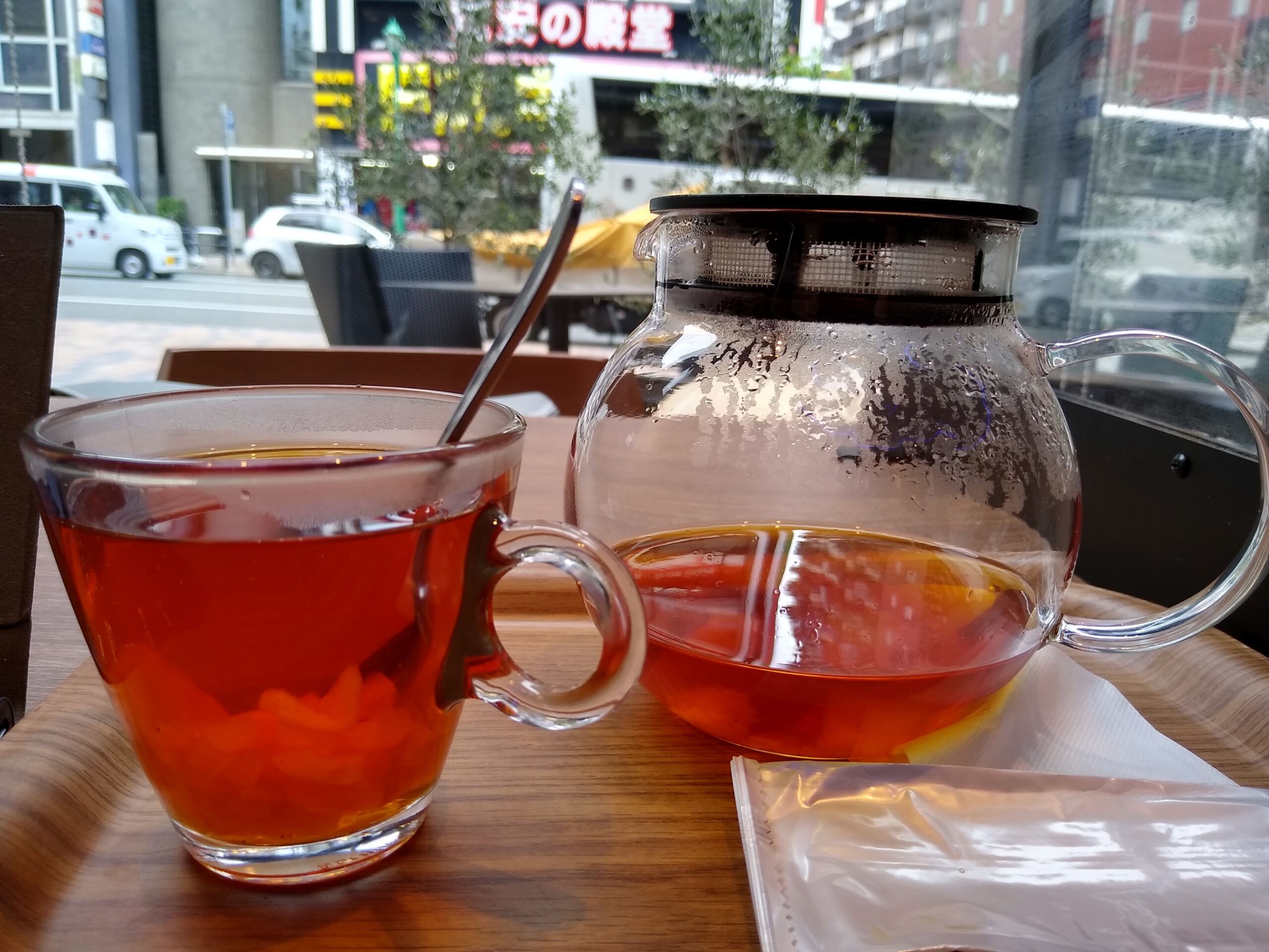 窓辺の明るいお席で、道行く人や車を眺めながらフルーツティって何て素敵…
