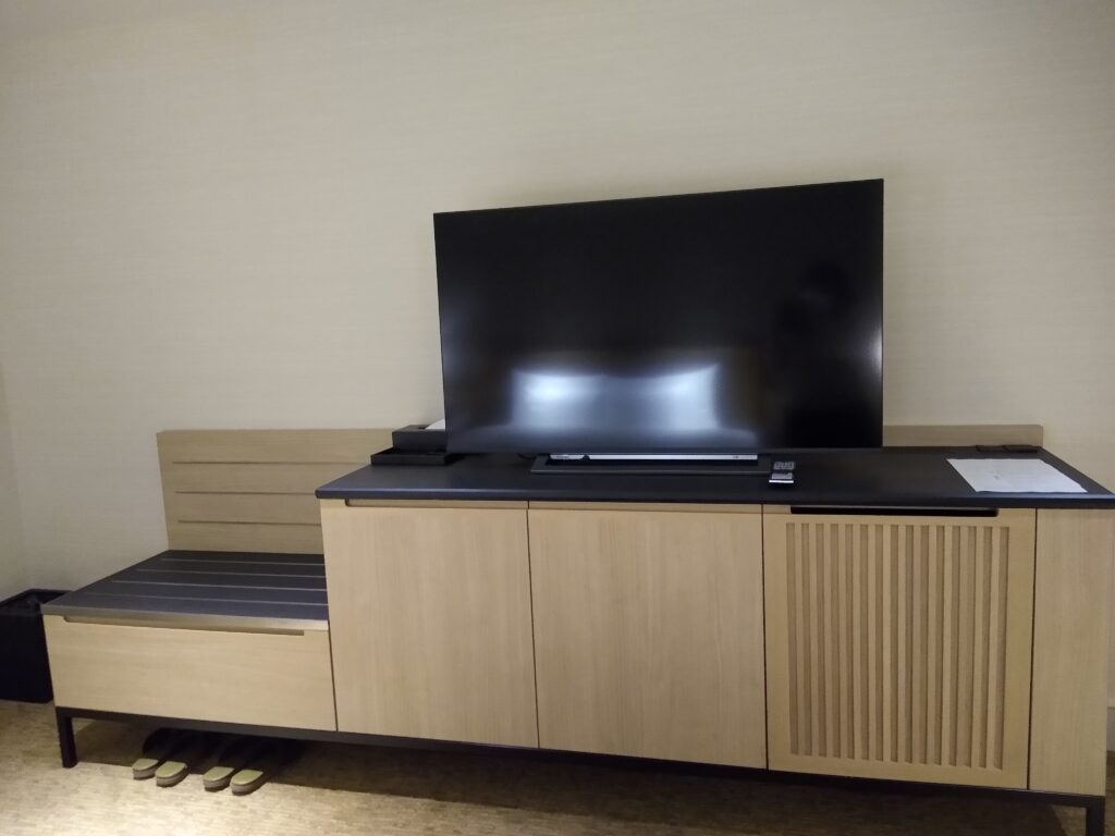 大きなバゲッジスペースのあるラックとテレビ、その下はミニバー&冷蔵庫です