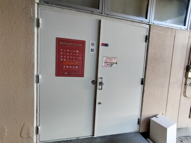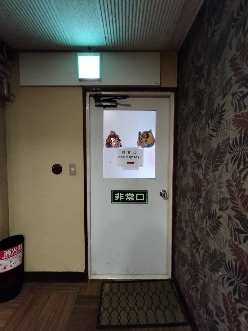 本館の大浴場の奥にある鉄製の非常口ドア、これを出て一旦外にでます