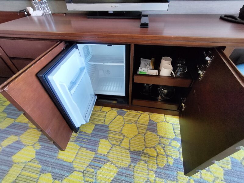 テレビとミニバー、バゲージラックなどは、ベッド足元の大きなカウンターデスクにあります
