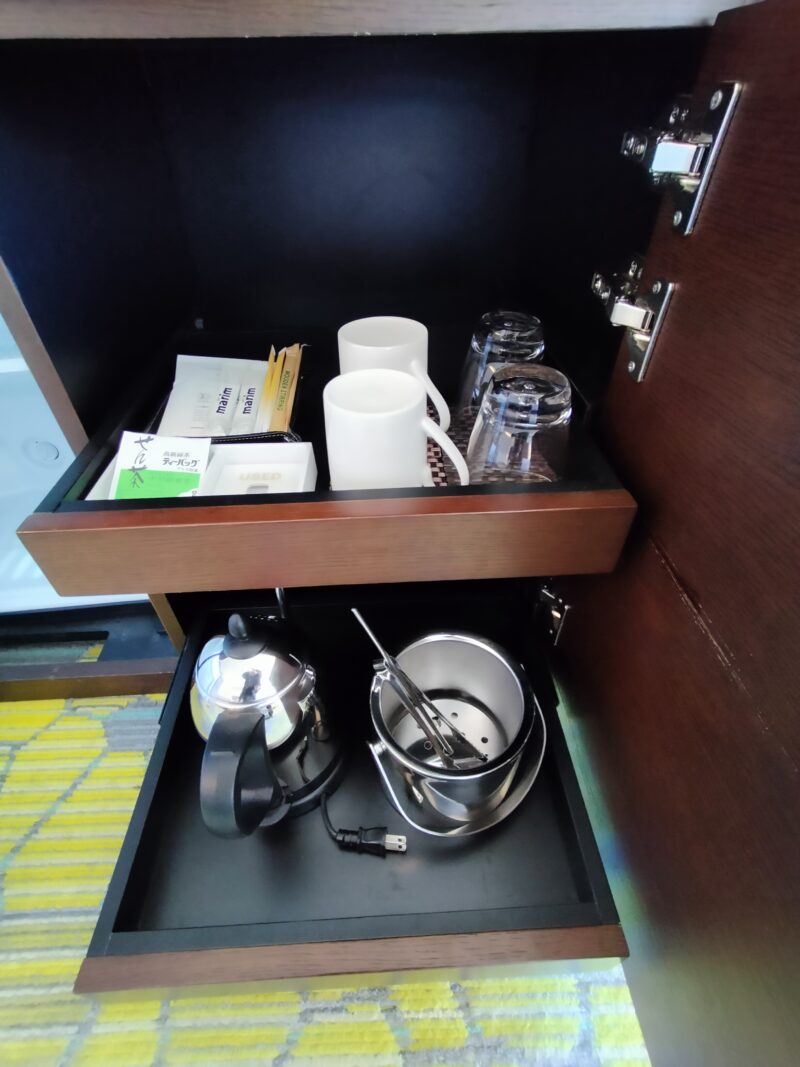 引き出しに見えるのは扉で、中には冷蔵庫やカップ類があります