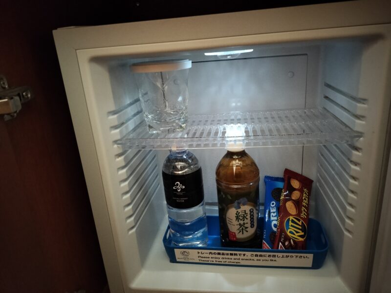 デスク下には冷蔵庫やミニバー関連があり、冷蔵庫の中には…