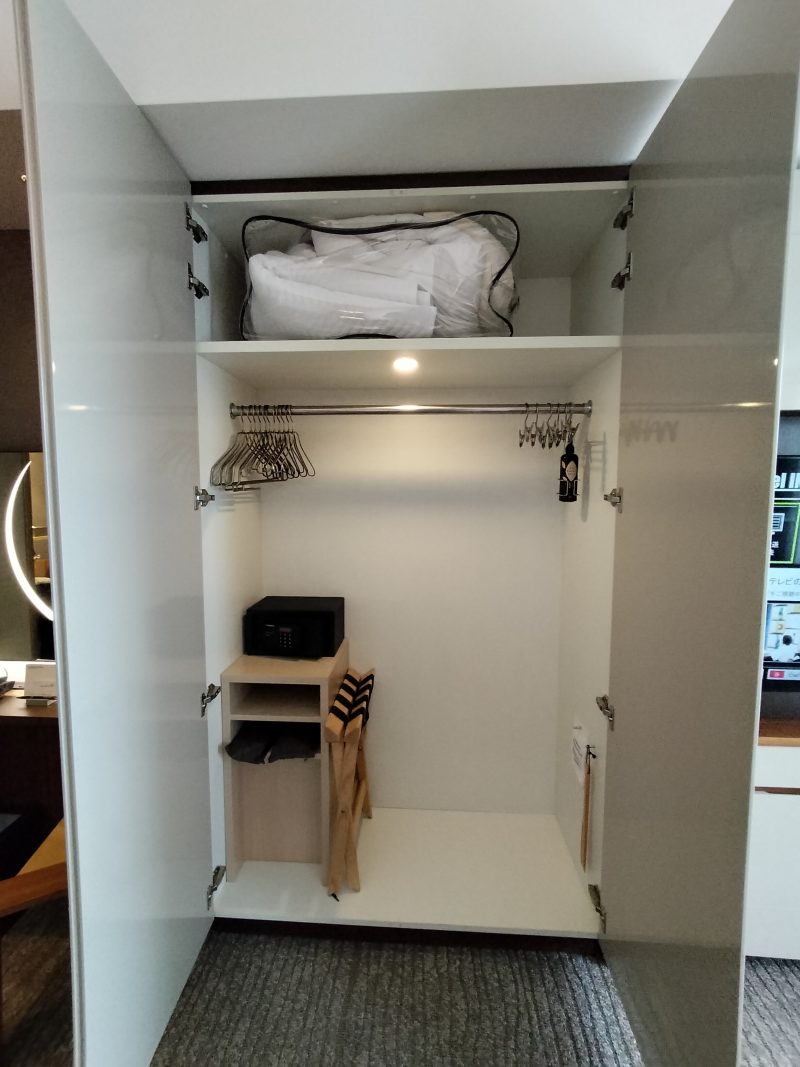 クローゼットの中にはバゲージラックや金庫、使い捨てスリッパなど