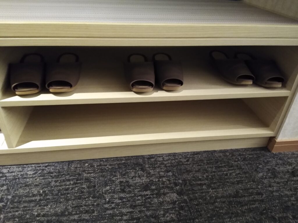 入って左手にはオープンタイプのクローゼット。下にはバゲージラックとスリッパがあります