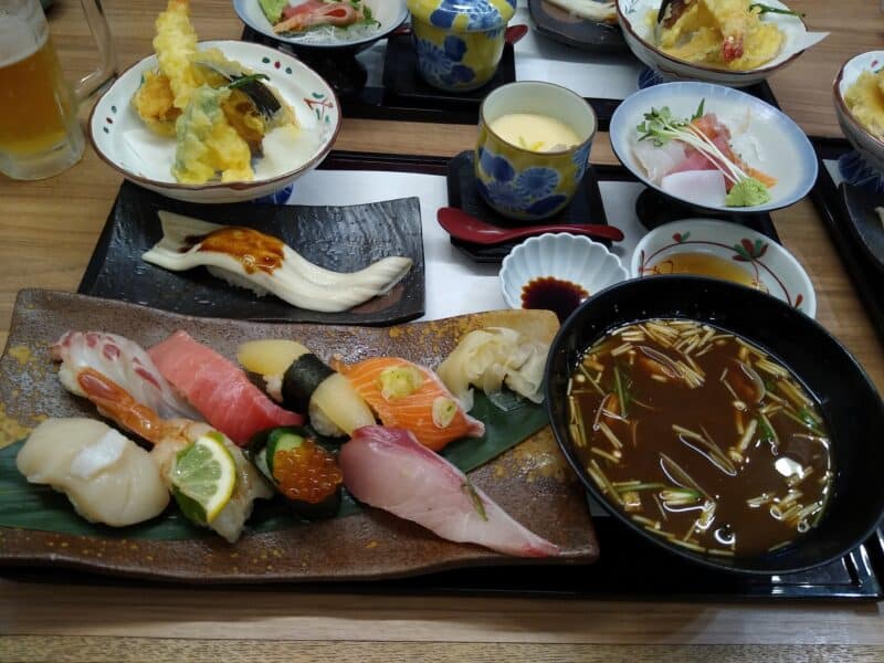 お刺身もお寿司もぷりぷりで、天ぷらはサクサク😊赤だしもたっぷりで美味しい~