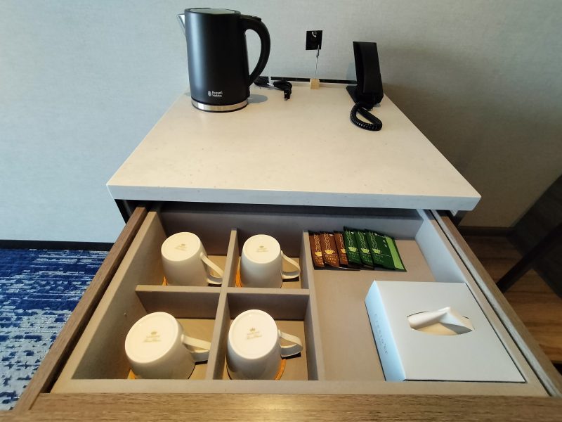 クローゼットの横のミニバーにはカップと緑茶とほうじ茶のティーバッグ