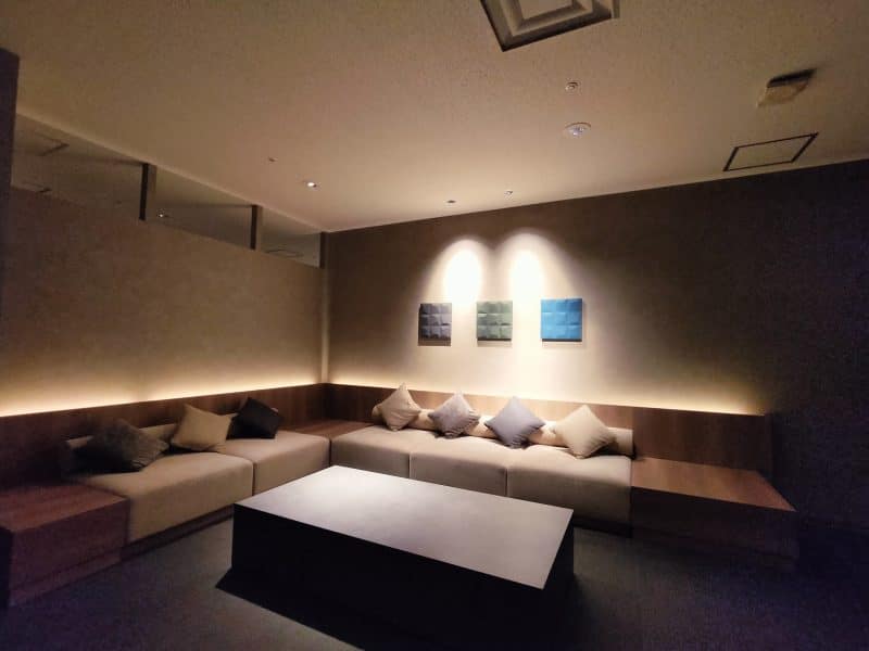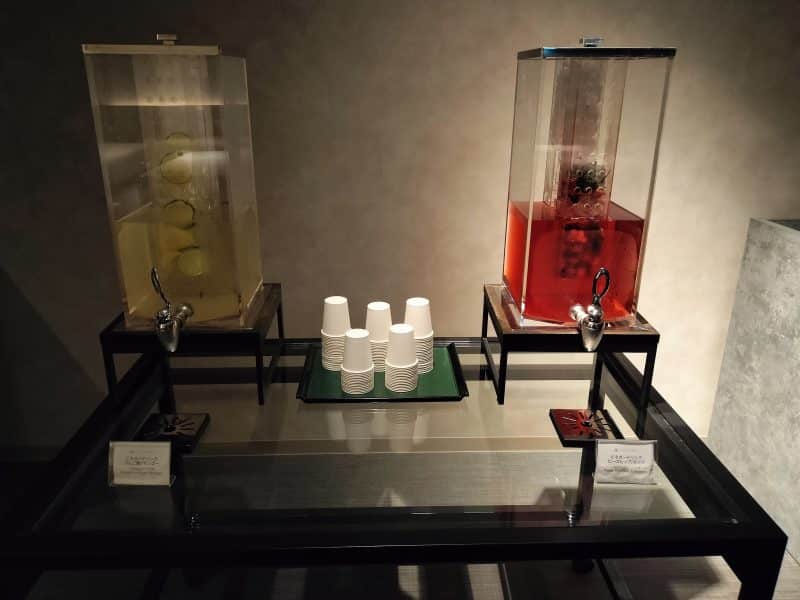 仄暗い照明がとても落ち着くスペースで、無料のドリンクもあります