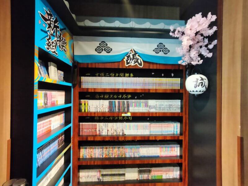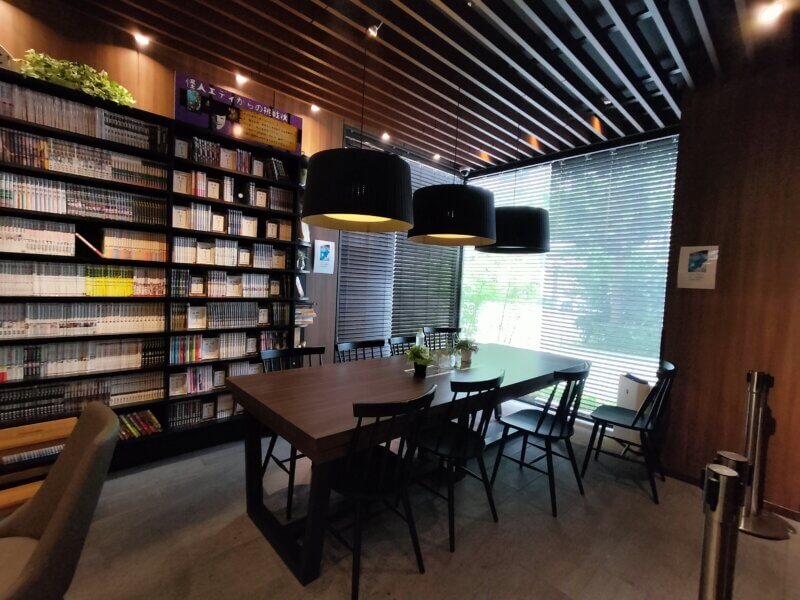 10,000冊の漫画の棚とテーブルセットがコンパクトなスペースにぎゅっとあります