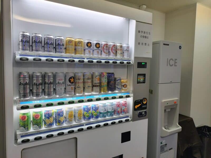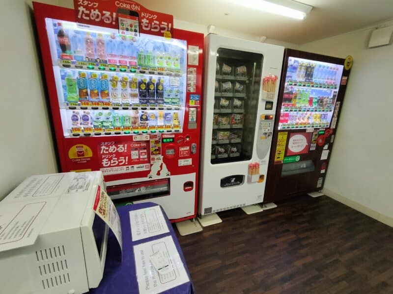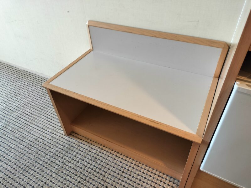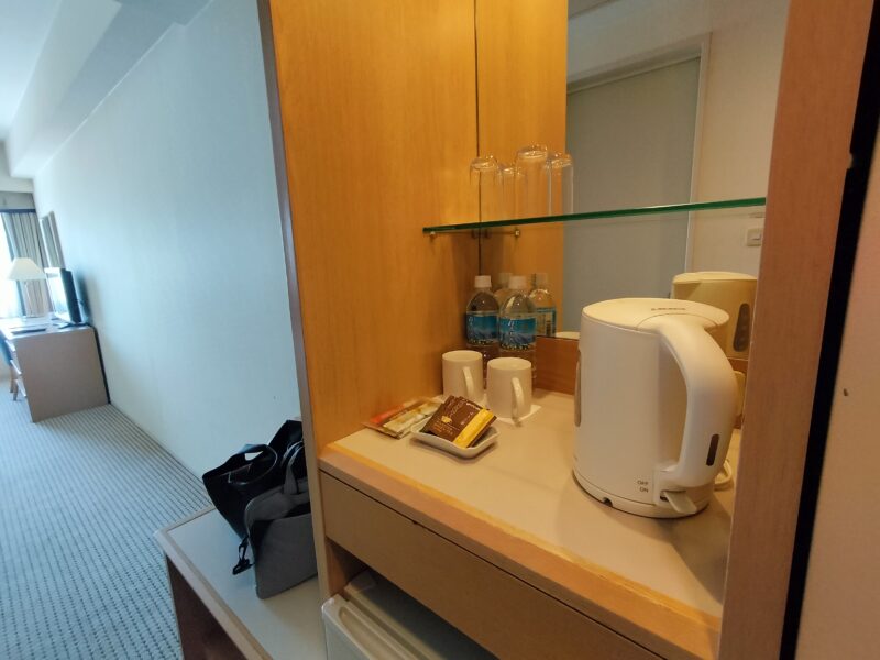 下段には空の冷蔵庫、上段には無料のお水やティーバッグなど