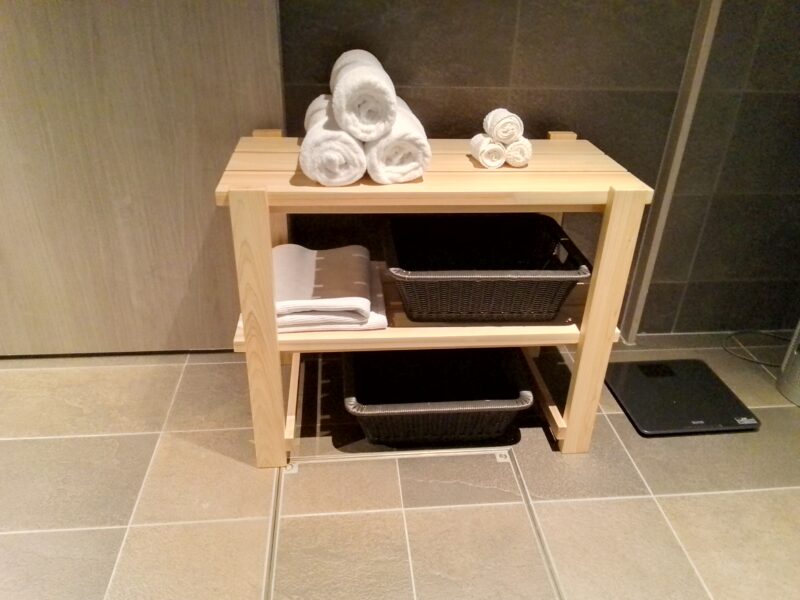 ここにタオルなどが置いてあるので、まず下の段の大きなバスマットを引いて