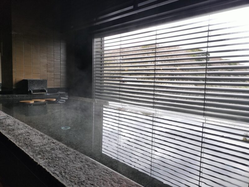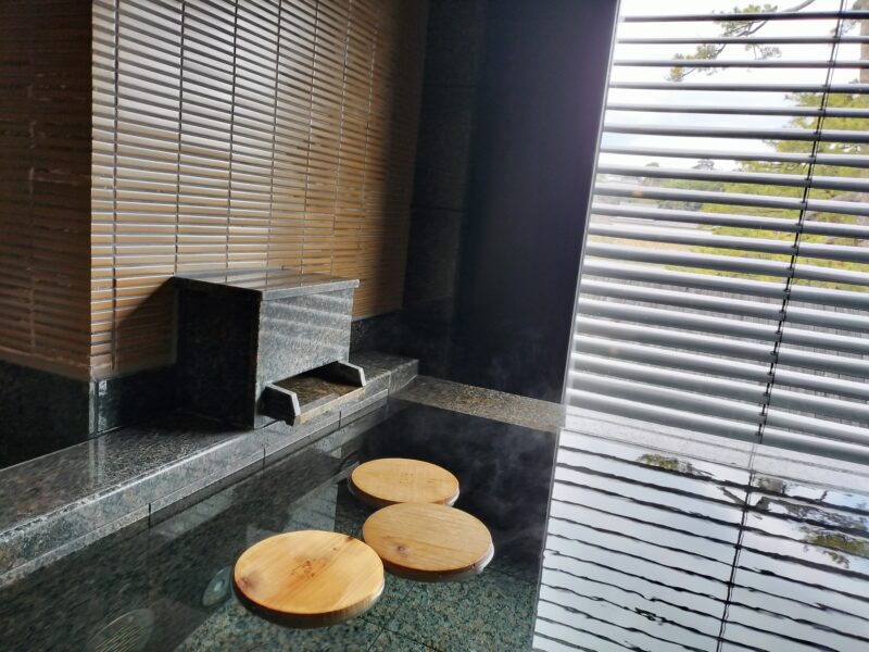 大きい方の浴槽は木製のブラインド的なものがおりていますが、普通に隙間から彦根城やお堀が見えました☺️
