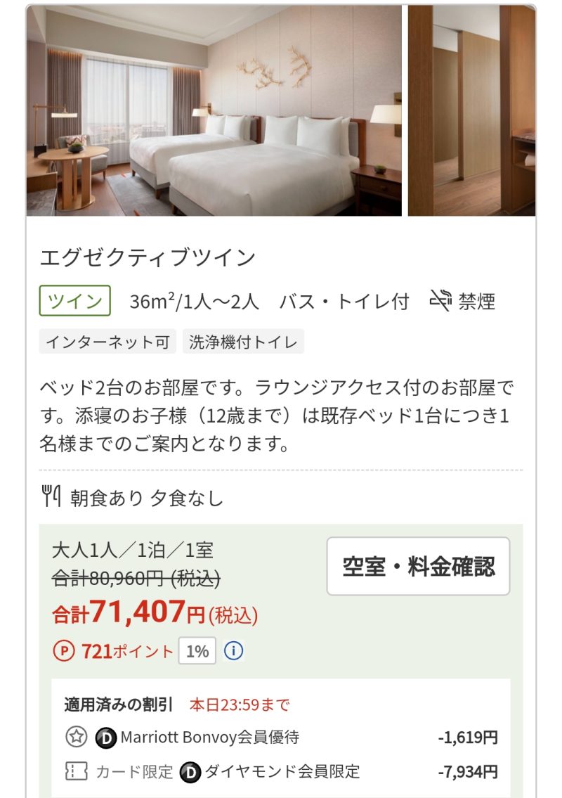 ホテル公式HPからの予約やマリオットボンヴォイアプリからの予約が一番安い!