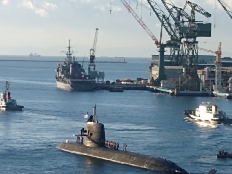 ホテルの向かいの川崎重工の造船所で潜水艦の進水式?が始まっていました😍