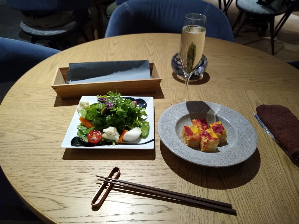 私はなんだか卵焼き的なものとサラダ、白ワインを注文