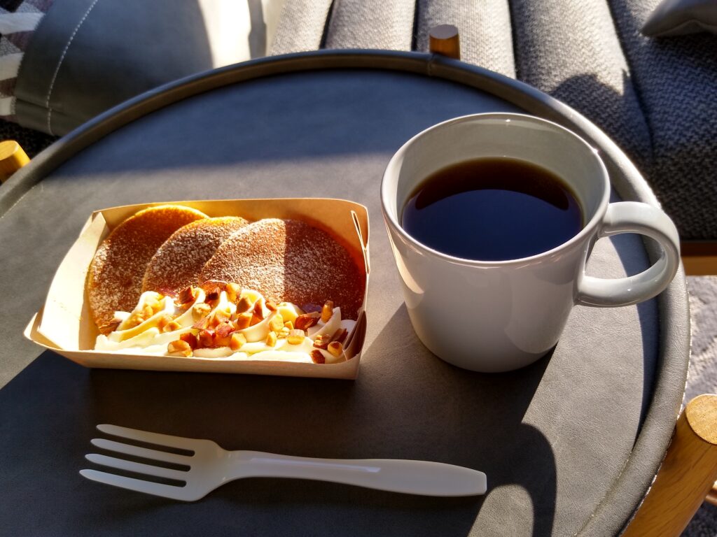 昨日コンビニで買っておいたパンケーキと部屋の珈琲で朝ごはんです