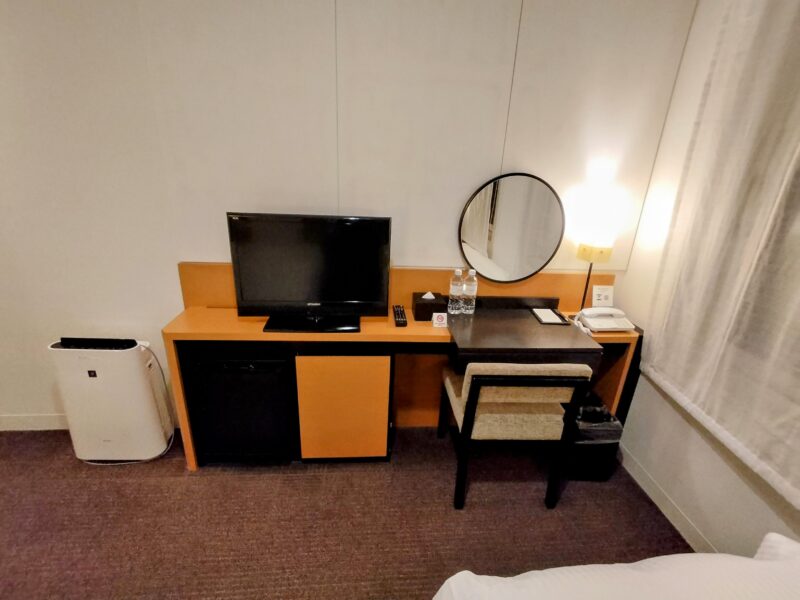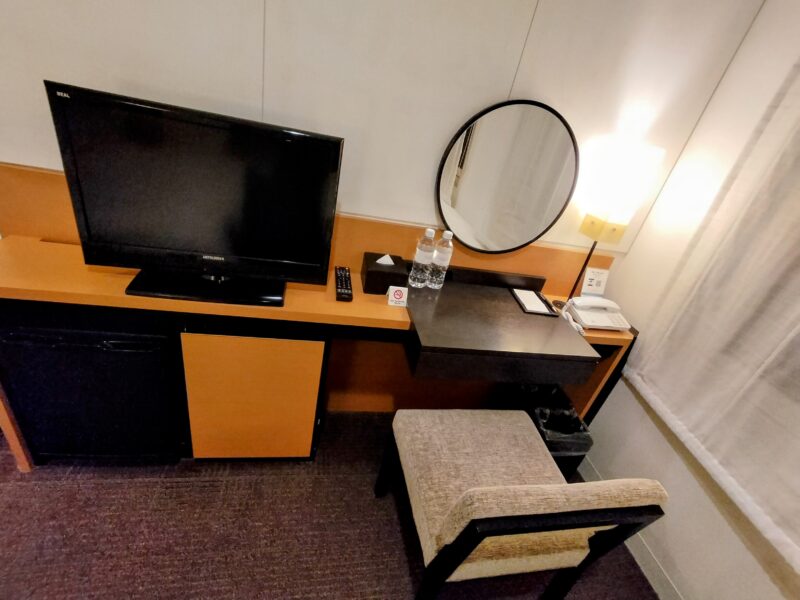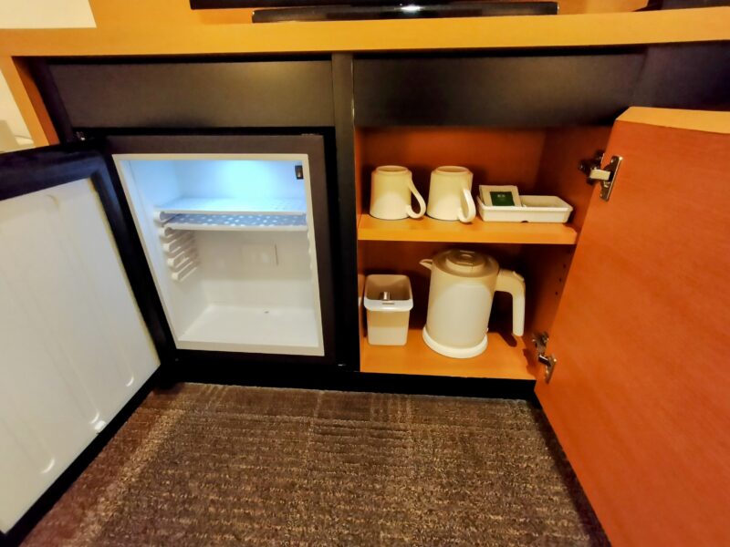 ドレッサー兼用のデスクや冷蔵庫などのミニバー関連もこちらに集約