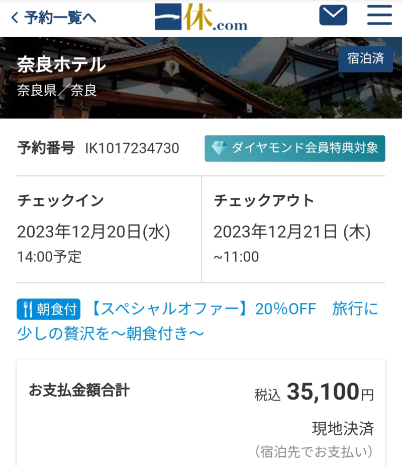 今回は宿泊予約サイト、一休で見つけたお得なプランで予約