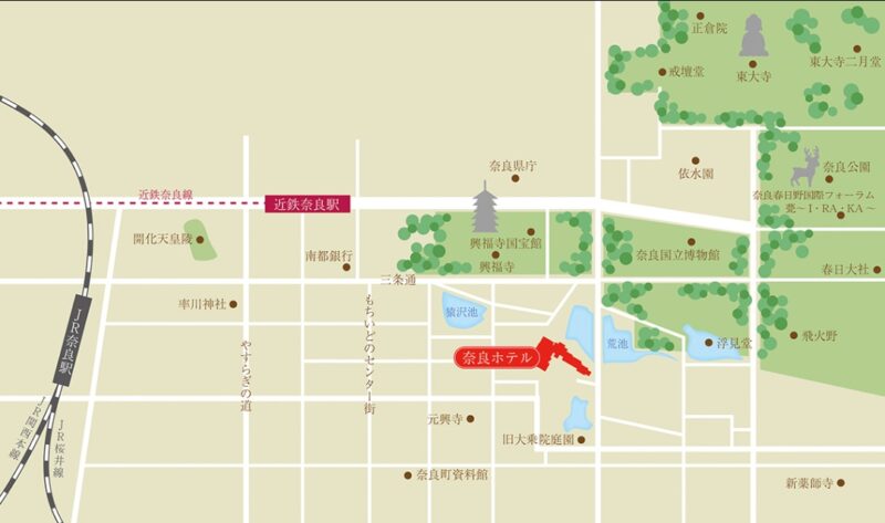 奈良ホテルは近鉄やJRの駅から少し離れた、奈良公園の南に位置します
