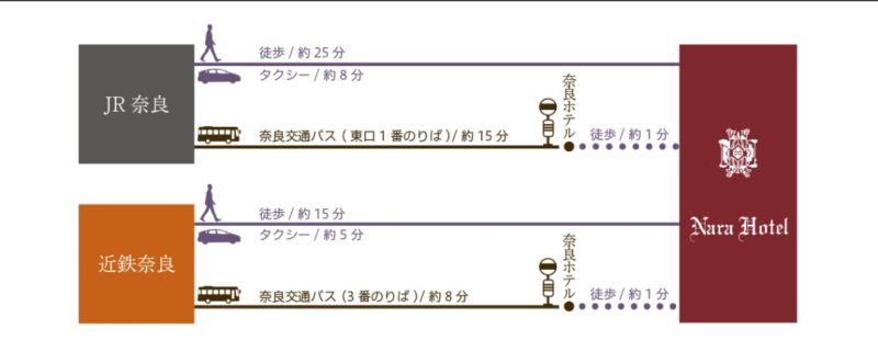 JR奈良駅や近鉄奈良駅から、天理方面行のバスに乗ると奈良ホテル前に停まります