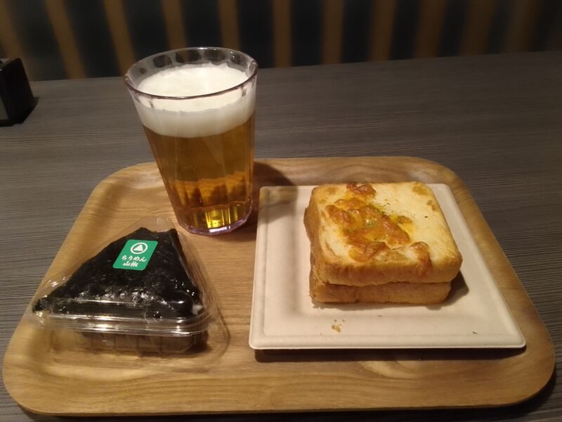 とりあえずのビールとクロックムッシュ(冷凍されているのをレンジでチンした)とおにぎり🥰