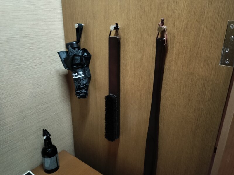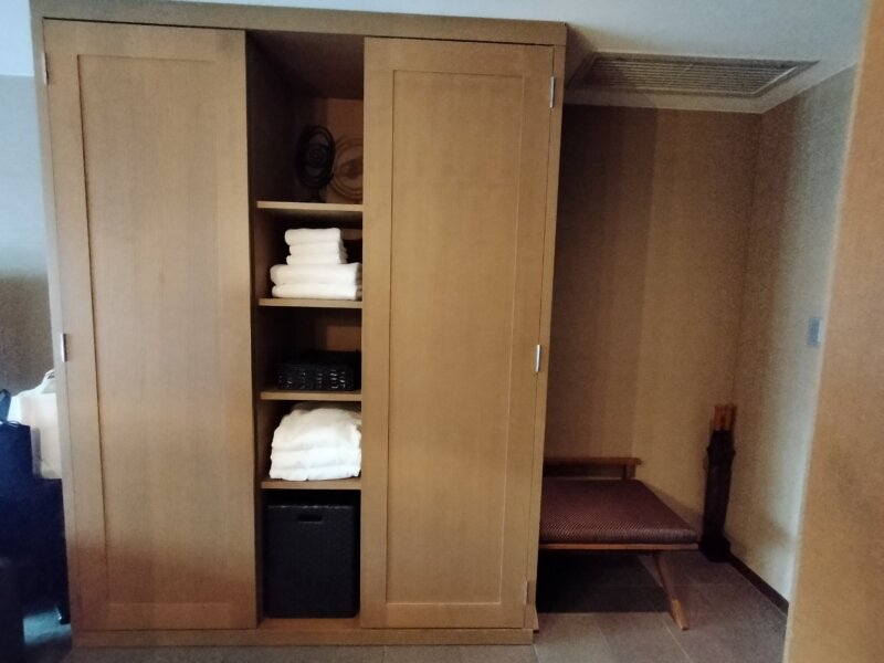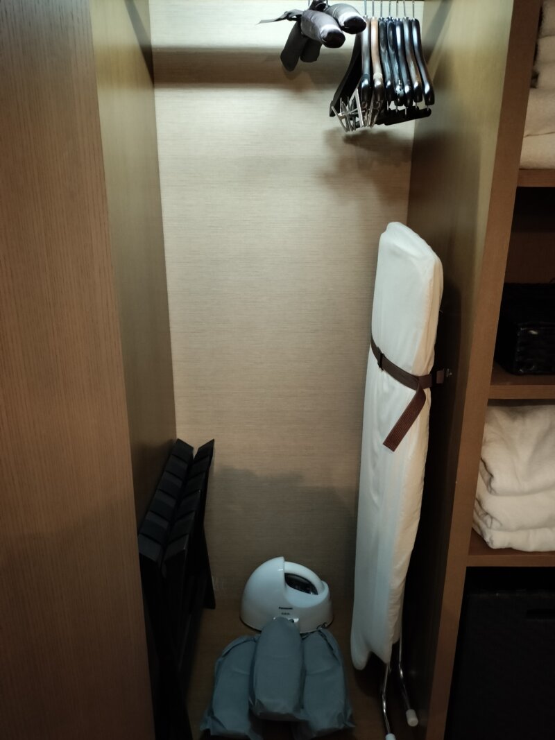 左側↓↓にはバゲージラックやアイロンセット、使い捨てスリッパ