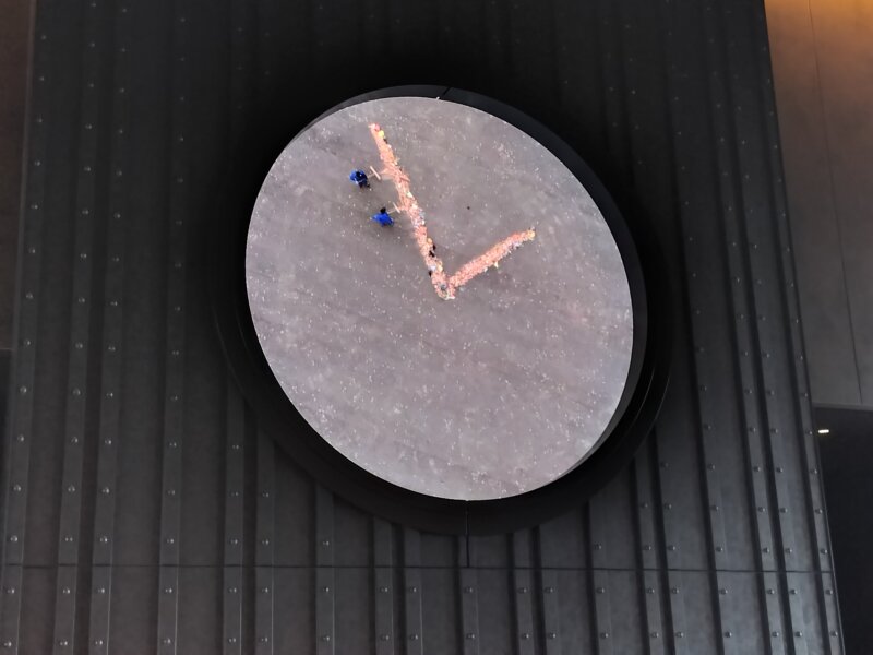 清掃スタッフがゴミをモップでひたすら動かして時計の針に見立てるの