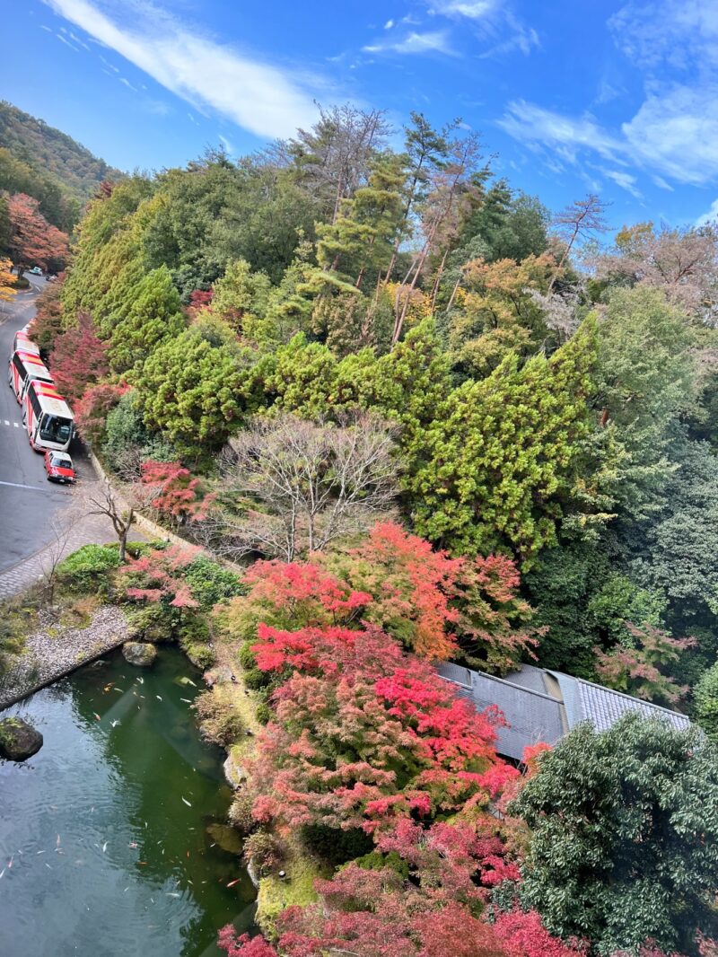 紅葉が始まっていました。茶室の屋根と紅葉がとても美しい…鯉も優雅に泳いでいました