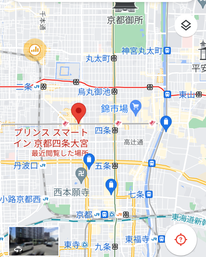 京都市バスの50番に乗り、四条堀川のバス停で降り2分程歩くとホテル到着👍