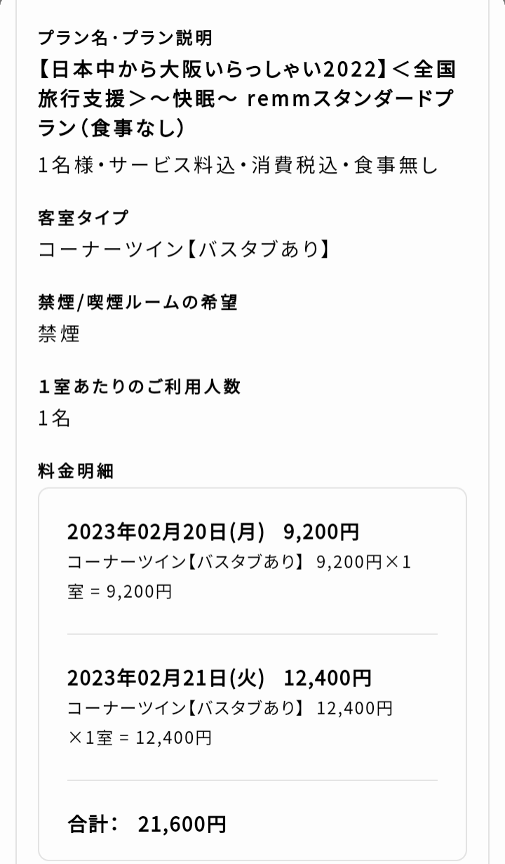 全国旅行支援が適用され、二泊で20%引きで17,280円