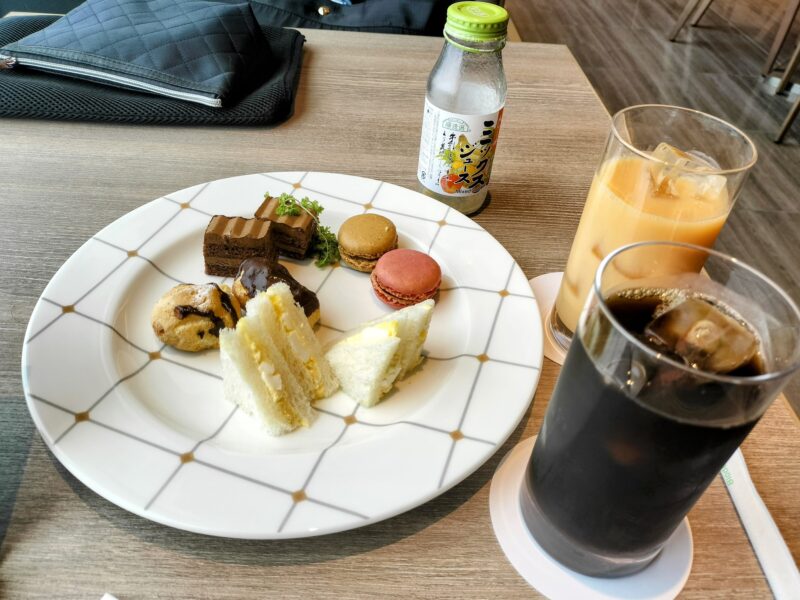 *マカロンやケーキ、サンドイッチなどとソフトドリンク