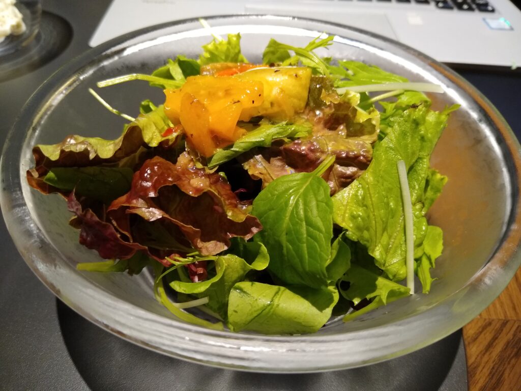 グリーンサラダも小ぶりなサイズで、ドレッシングが美味しくて何回もおかわりしたくなる