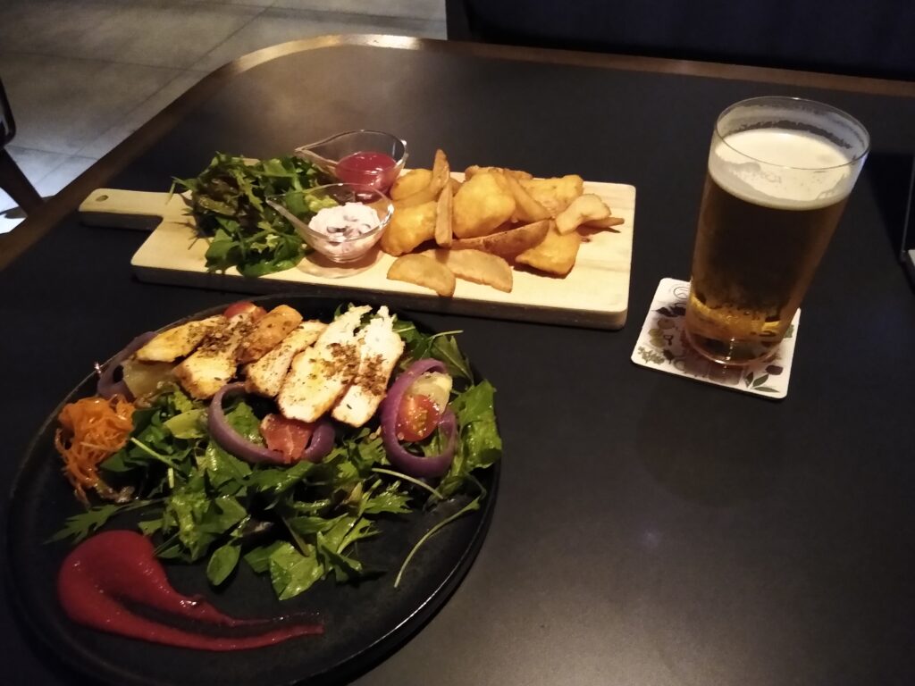 ビールと「虹色パワーサラダ」と「フィッシュアンドチップス」で乾杯🥂