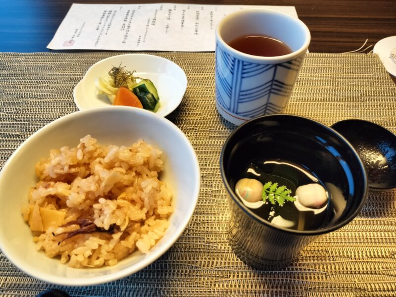 湯葉蒸しの器が、食べ終わると底から美しい桜がでてきて目でも楽しませてくれる