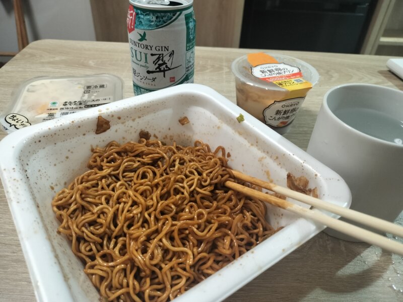 今回は(も)お部屋でグータラしたかったので、ソファにあぐらをかいて焼きそばとジンソーダとプリン🍮✨