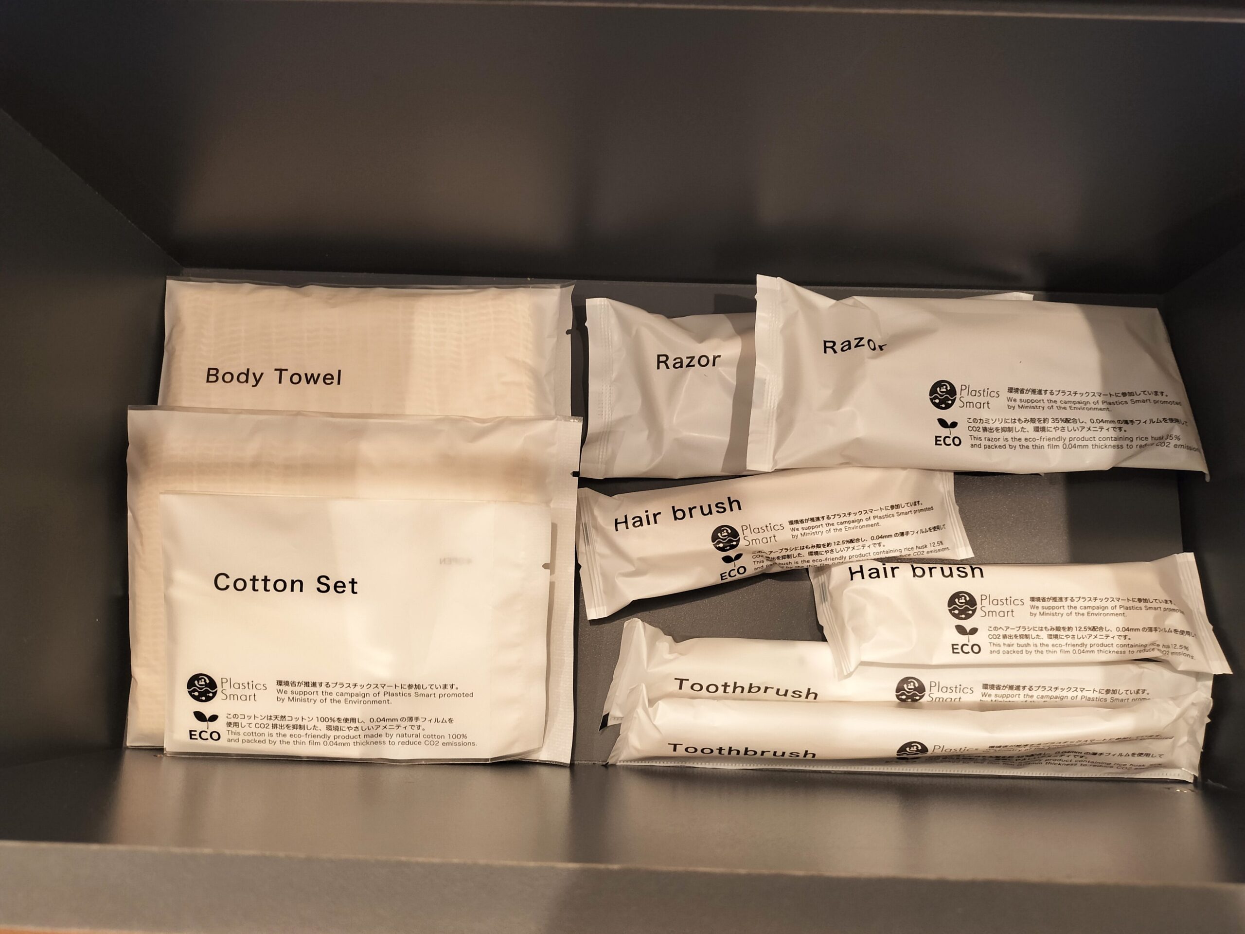 クローゼットの中には使い捨てスリッパや消臭剤など