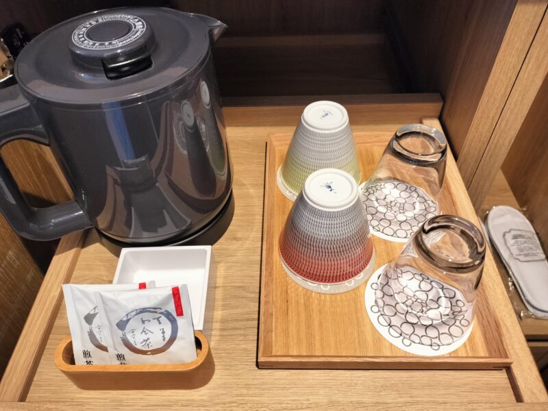 ミニバーの中には可愛いコップ類と緑茶のティーバッグ