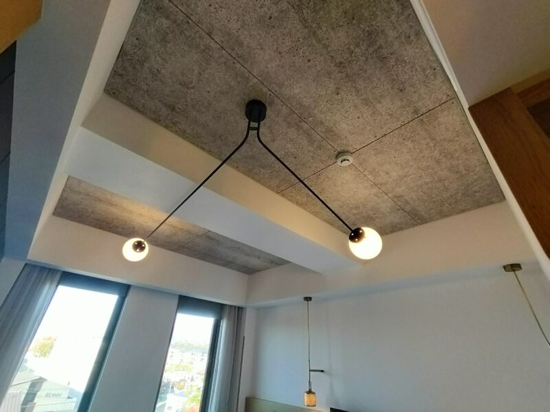 木の質感と天井のコンクリート、ライトもおしゃれなの😆
