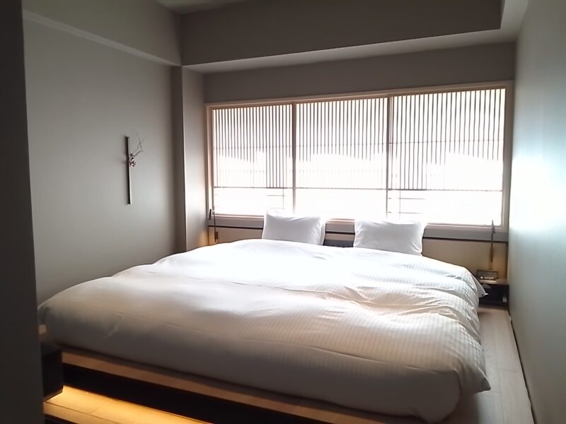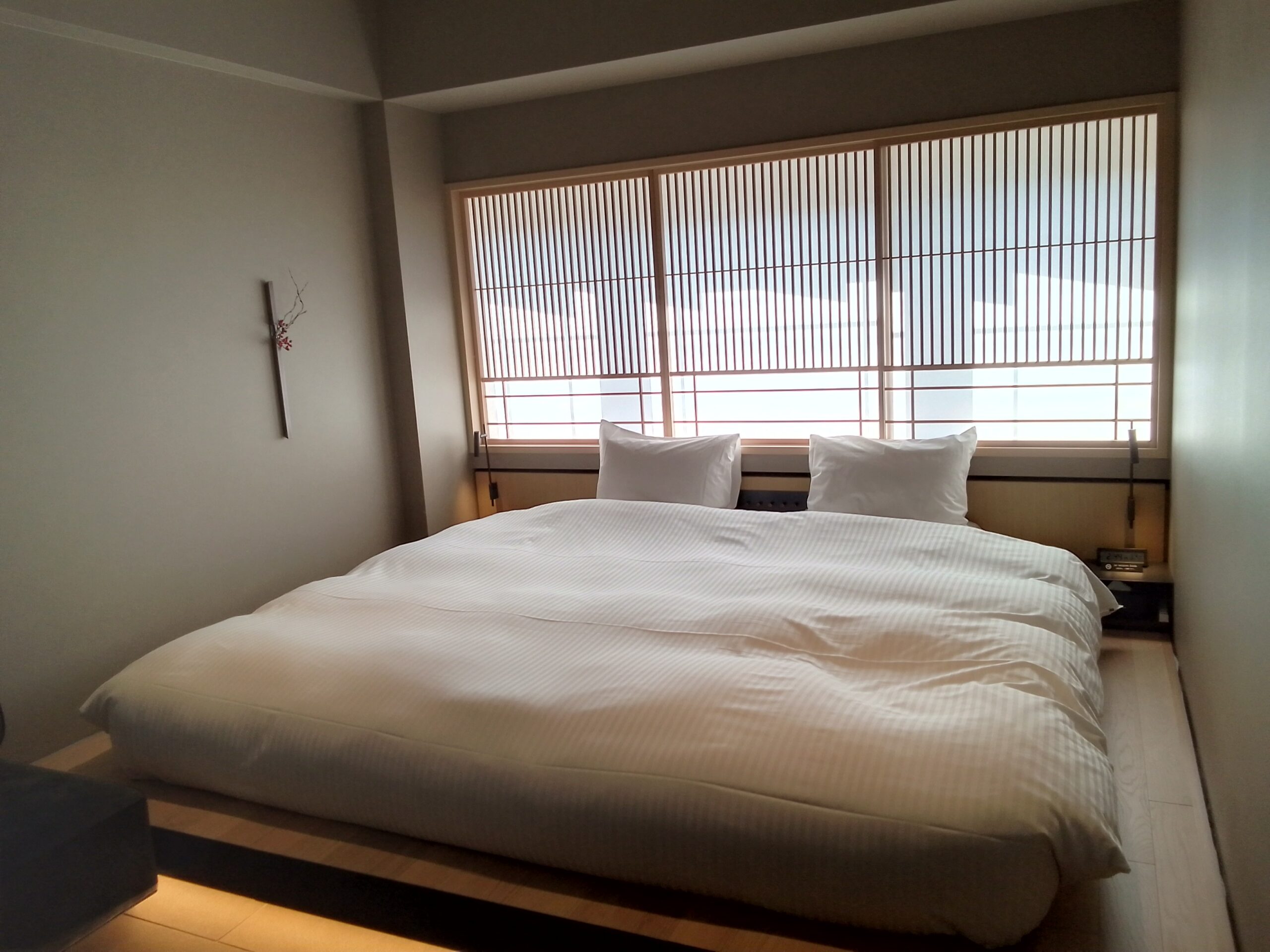 ベッドは小上がりになった板の間にマットレスが置かれているタイプ