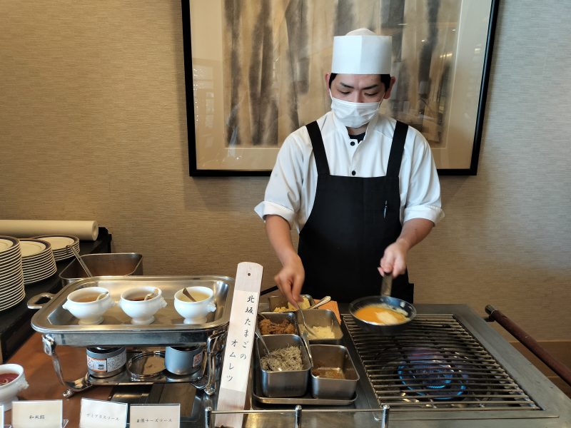 ライブキッチンでは、具材をリクエストすると目の前でオムレツを作ってくれます